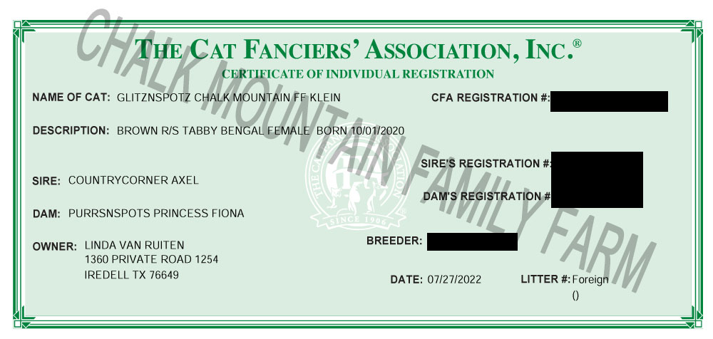 Parts of the paperwork may be blacked out for privacy purposes. Scammers have already stollen Chalk Mountain Family Farm photographs, we appreciate your patience while we try to protect ourselves. However, If you would like to see the full paperwork please reach out.Kitten Purchase Documents: