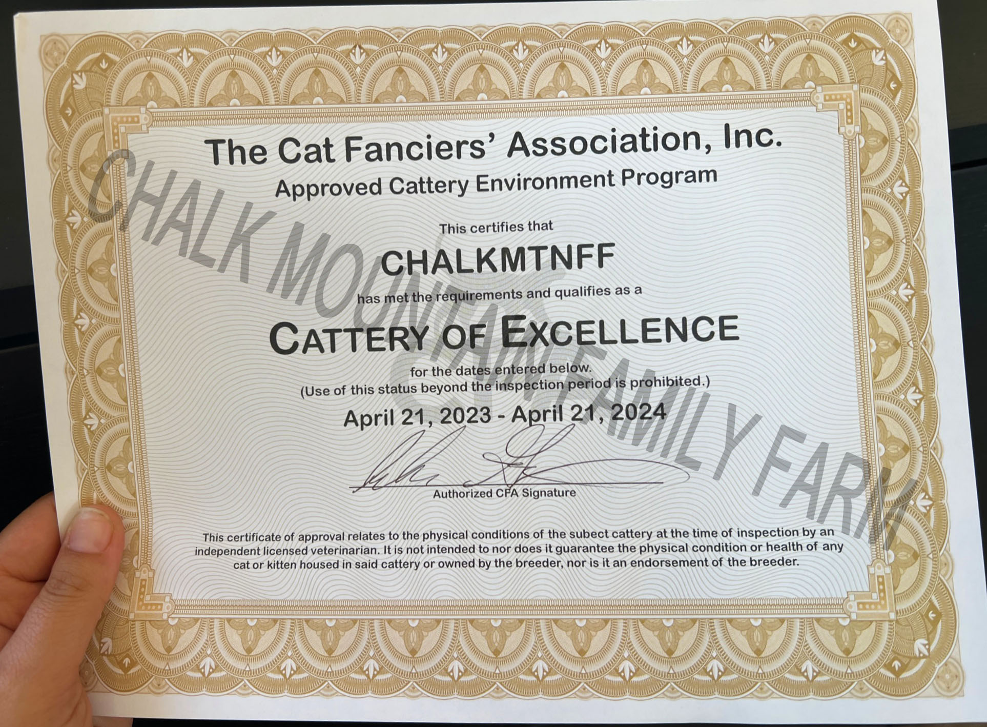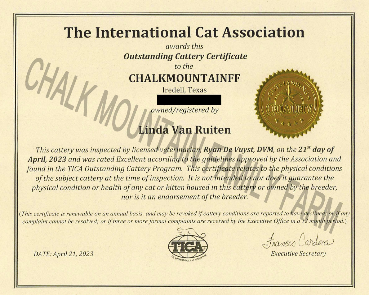 We are qualified as a "Cattery of Excellence" by CFA. Cattery of Excellence AwardWe were also awarded the "Outstanding Cattery Certificate" by TICA. Outstanding Cattery Certificate